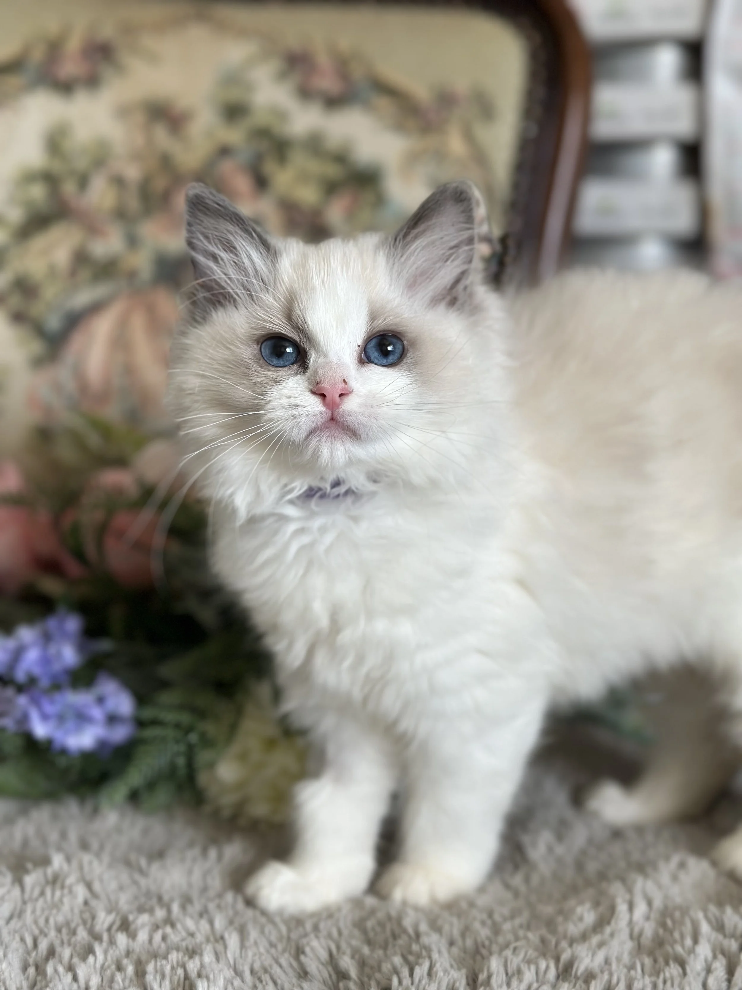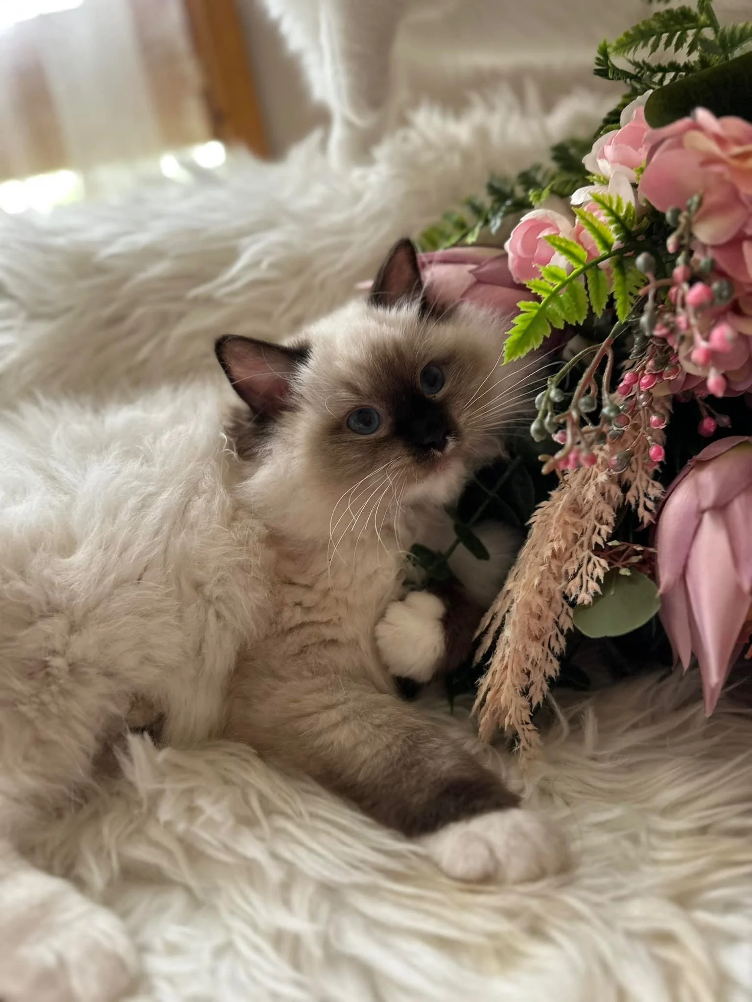 We provide a kitten care bag that includes food for the next few days, toys, a brush, and a blanket that smells like their mum and siblings. You will also receive a booklet with all the essential information you’ll need to care for your new Mayflower Ragdoll.